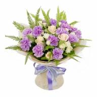 Столь утонченный букет – это подарок, который поможет извиниться перед дорогим человеком, выразить глубокие чувства искренности и уважения. Лиловые гвоздики в сочетании с бежевыми розами составляют изысканный ансамбль, который подарит улыбку и получателю, и вам. Яркую цветочную композицию можно преподнести в честь памятной даты и другу, и коллеге.